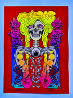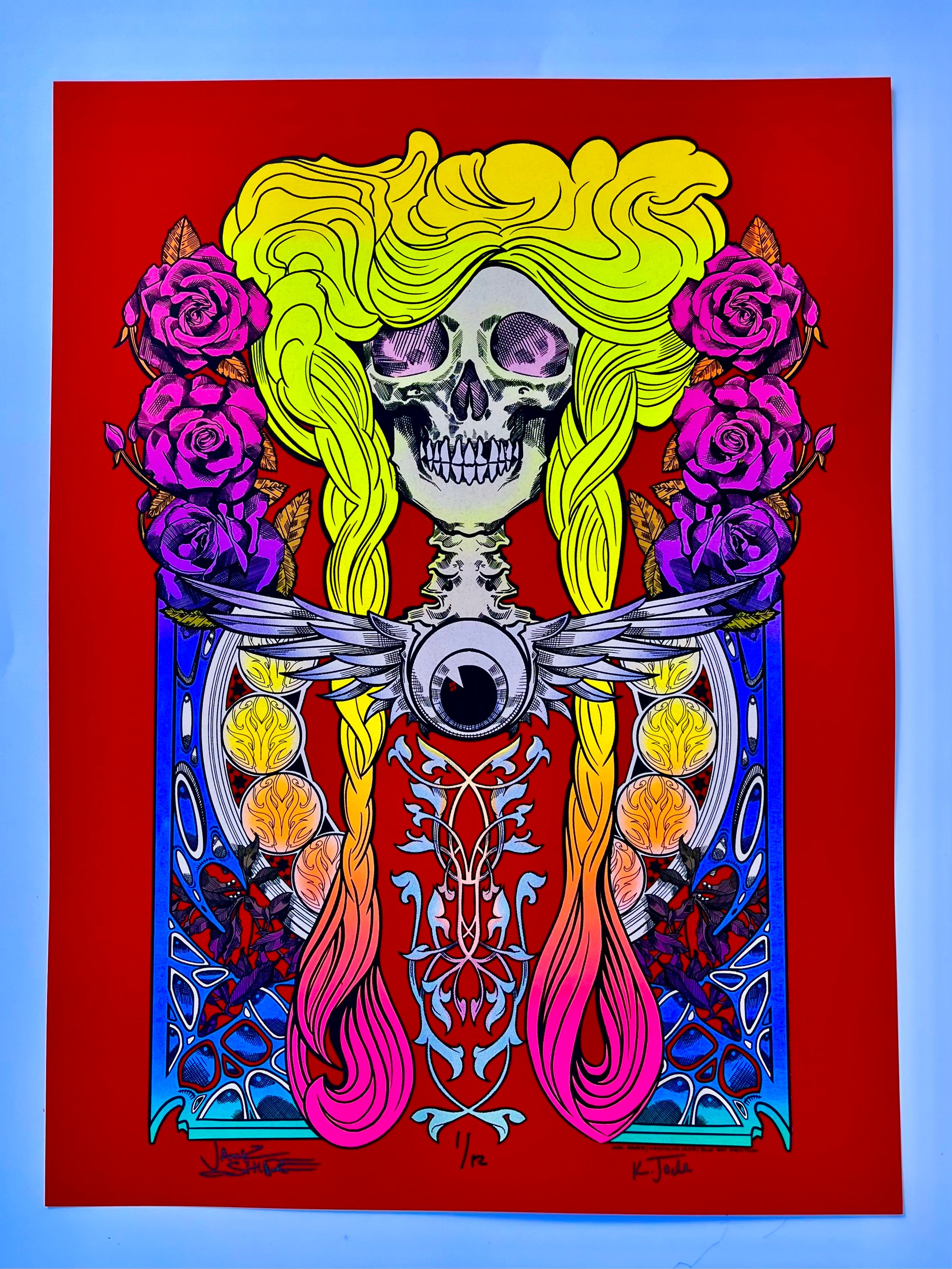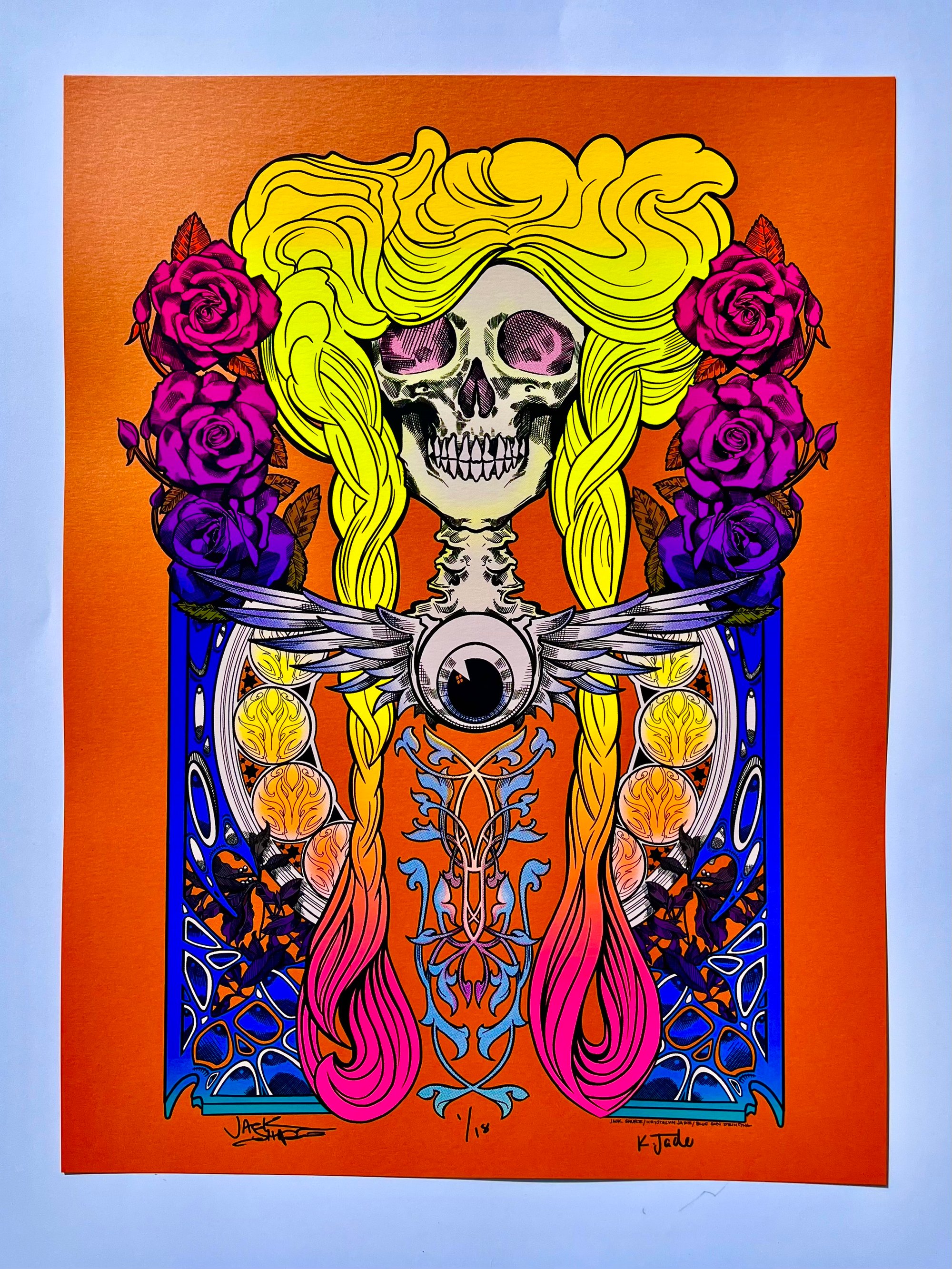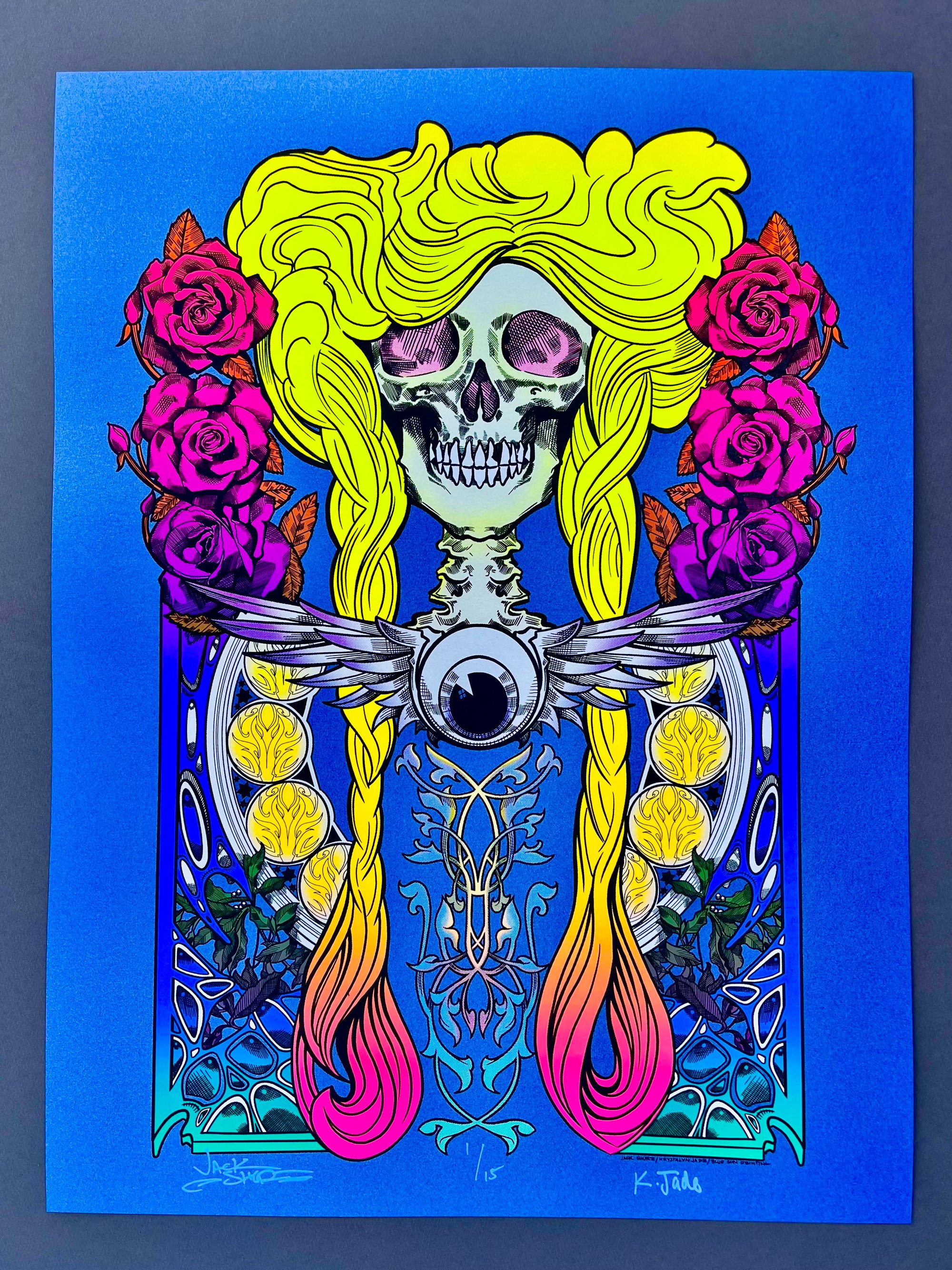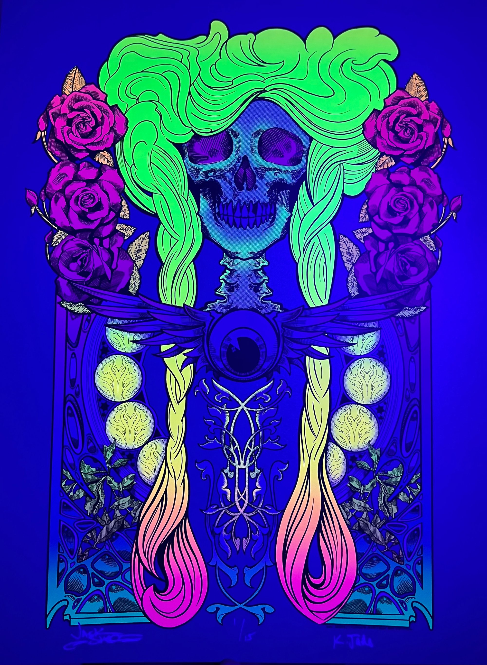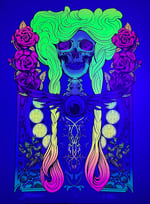 The Harvest Queen Silkscreen on Metallic Paper UV Reactive black light ink Editions Metallic copper 23 Metallic orange 18 Metallic blue 15 Metallic red 9 Metallic silver 9 Metallic teal 4 Signed And Numbered Art by Jack Shure and Krystalyn Jade Printed by Blue Sun Printing Printed using vintage fountain screen technique resulting in all pieces being unique. Printed on top of the line metallic Paper